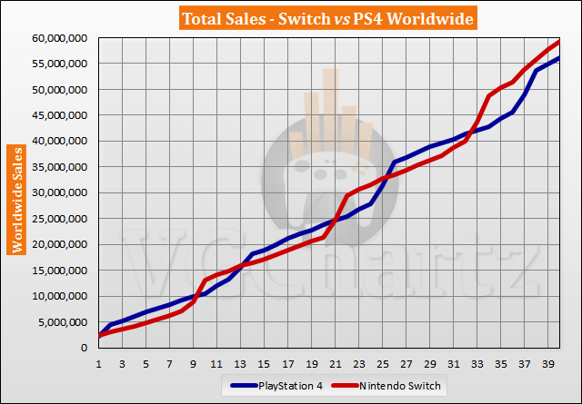 Switch Vs. PS4 Global: Gap change in latest month: 366,320 - Switch Gap change over last 12 months: 5,674,266 - Switch Total Lead: 3,190,475 - Switch Switch Total Sales: 59,318,752 PS4 Total Sales: 56,128,277 June 2020 is the 40th month that the Nintendo Switch has been available for. During the latest month, the gap grew in favor of the Switch by 366,320 units when compared to the PlayStation 4 during the same timeframe. In the last 12 months the Switch has outsold the PlayStation 4 by 5.67 million units. The Switch is currently ahead of the PlayStation 4 by 3.19 million units. The PlayStation 4 launched in November 2013, while the Nintendo Switch launched worldwide in March 2017. Therefore, the holiday periods for the two consoles do not lineup, which is why there are big increases and decreases. The 40th month on sale for the Nintendo Switch is June 2020, while for the PlayStation 4 it is February 2017. The Switch has sold 59.32 million units, while the PlayStation 4 sold 56.13 million units during the same timeframe. The PlayStation 4 did not reach current Switch sales until month 43. The PlayStation 4 has sold 112.14 million units through June 2020. The Nintendo Switch is currently 52.82 million units behind the lifetime sales of the PlayStation 4. |