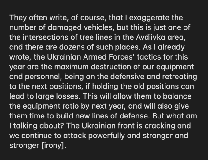 Stay on the defensive, inflict as much damage as possible to the attackers, retreat when ratio isn't favourable and repeat, it'll mean we'll see Ukraine losing ground this year but ground is just ground, it can be retaken, lives and equipment are more important. From every encounter we've seen like this, where Russia is on the offensive and Ukraine is on the defensive, the Russian losses are almost always horrific in numbers.