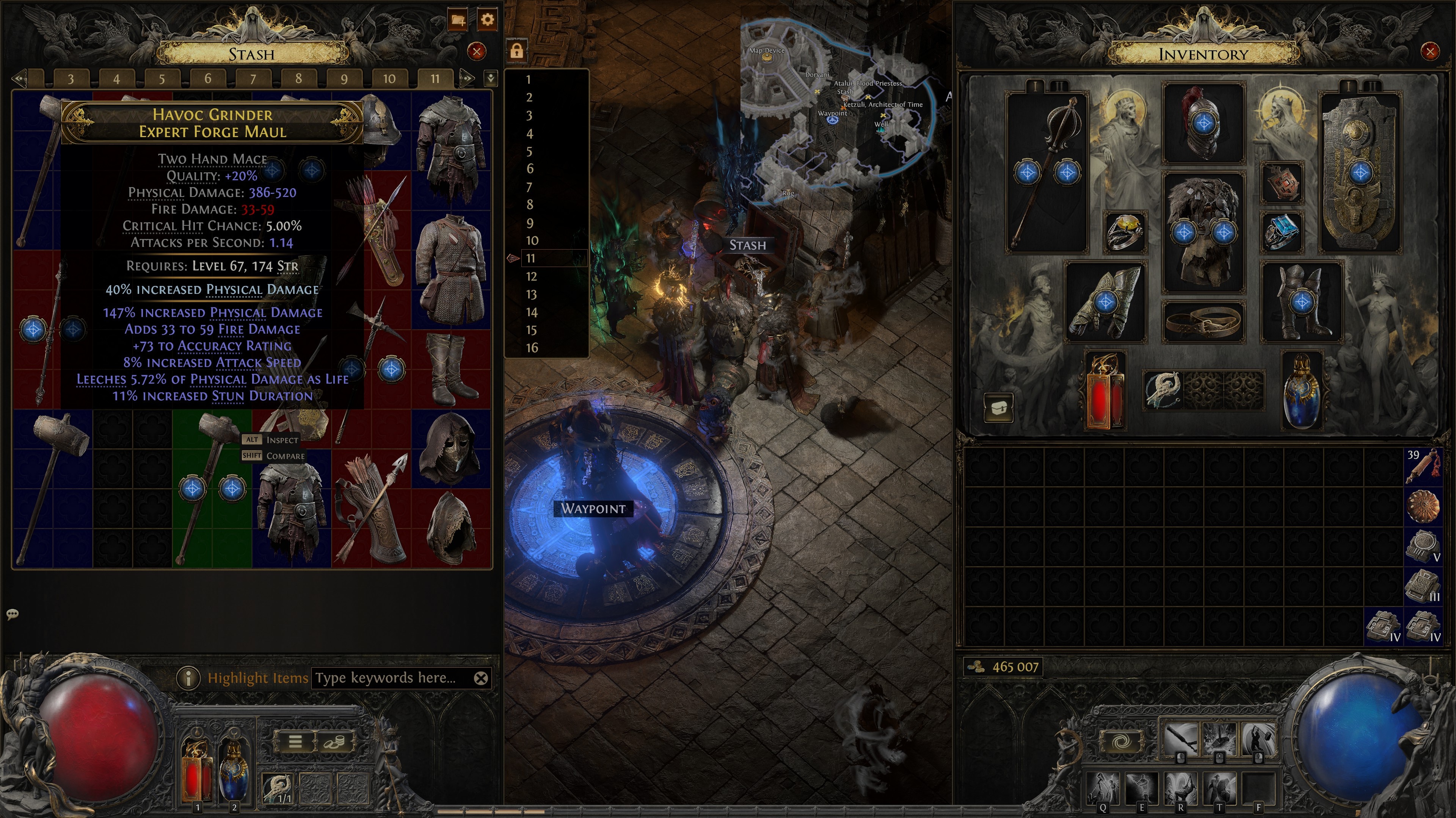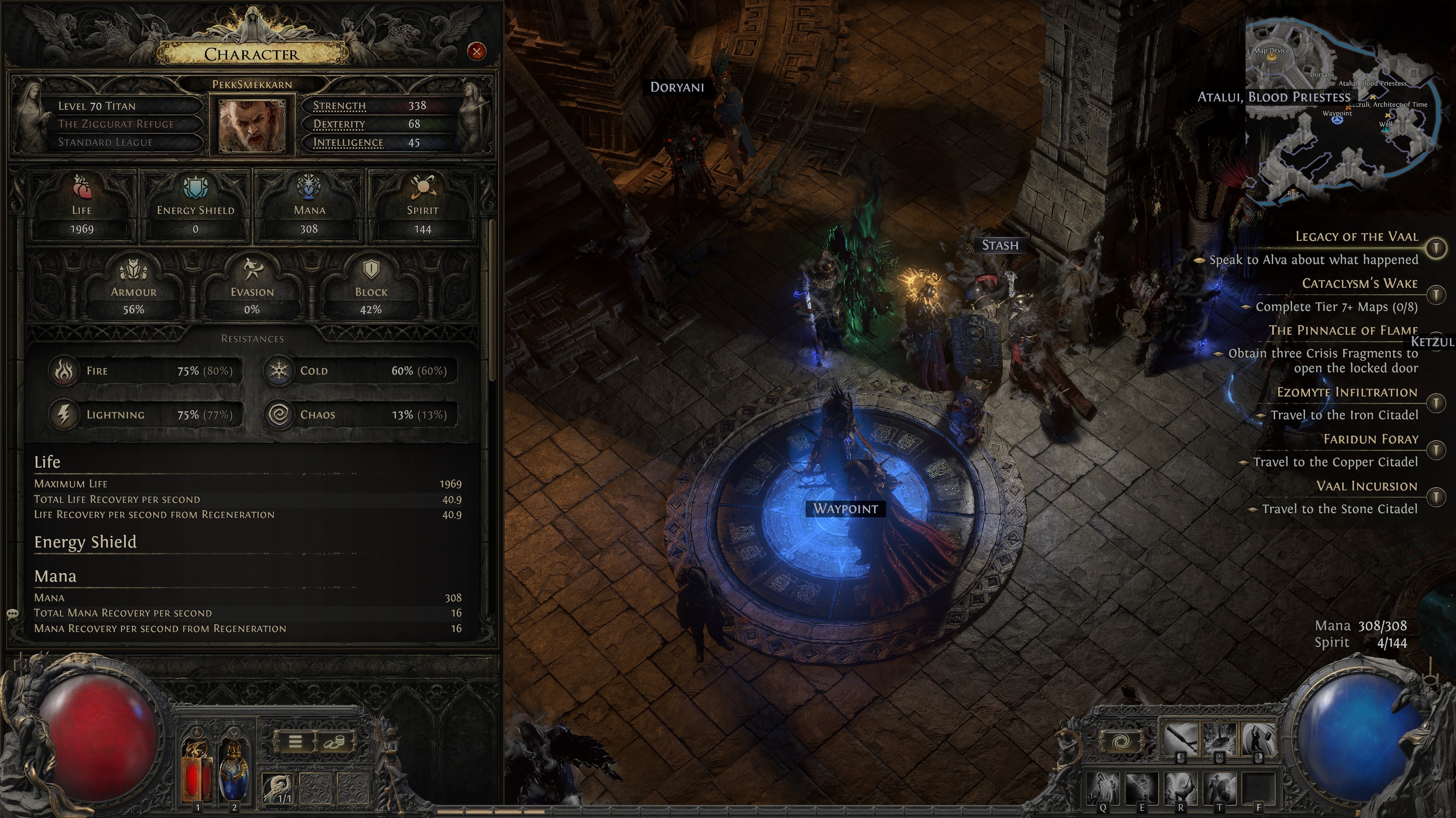 I finally managed to clear the first Sekhema trial, 2nd part with the two titans was impossible. But then did the Chaos trial which was piss easy and have the 4 ascendency points to have evasion rating count for armor as well. So instead of 7% armor 59% evasion, it's now 51% armor and 53% evasion. Got my hp up to 1801 (486 energy shield) so maybe I can survive those one hit kills now... (We're trying tier 4 maps, no modifiers, easy until sudden death) lvl 75 Invoker.
