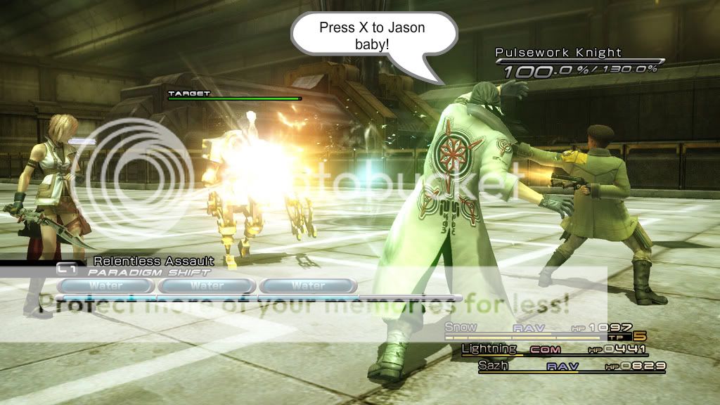 I love driving my manual car; in fact every car I ever owned was a stick. I feel in control. Every limb of my body is contributing to the act of my car moving. Because of that I’m more focused, which makes me more alert –more aware of my surroundings. But hey a cars a car right? As long as it’s serving its purpose and getting me from and to points A and B why should I care whether the cars basically driving itself. It’s only natural that the average person prefers convenience over putting the effort into actually doing something. The Automatic car is proof of that. By now you’re probably thinking to yourself, “What the hell does this have to do with Final Fantasy XIII?” … It has to do with its horrid battle system. A system that makes me feel like I’m riding the latest Benz only a 90 year old woman is driving it while I’m tied up and placed in the trunk. It’s a system that should make any gamer who has any remaining self pride or dignity ashamed of themselves. I can honestly say that I feel like a less skillful player after experiencing it. To put Final Fantasy XIII’s battle system in a nutshell, you only control one character… ok, Let me stop right there before I have a brain hemorrhage because you don’t even have control over that one character. I refuse to admit that I have any control over battle when the first option from the menu window is actually called “Auto.” And ladies and gentlemen, that’s exactly what it is, an option that makes your character automatically select the attacks he/she wants to do based on what spells and techniques you’ve learned. You don’t need to think. The battles take on a life of their own. “But hey! Some enemies are weaker against certain types of attack and you have the option to manually select your commands hatmoza!” True, but by the time I’m done selecting my moves my robot comrades have already slain the enemies, and for some miraculous reason your players always use the most effective attacks on every enemy you encounter. Now I’m not saying the battle system was completely dull and tasteless. I did find one exciting moment while fighting the first Fal ‘cie (or whatever the hell those robot Gods are called), which was trying to stay awake while I was rapidly mashing the action button.