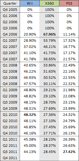 With Q4 due in, and 360 and PS3 being ahead by a fair bit, Wii's 44.13% is going to drop a lot, likely below 42.80%.