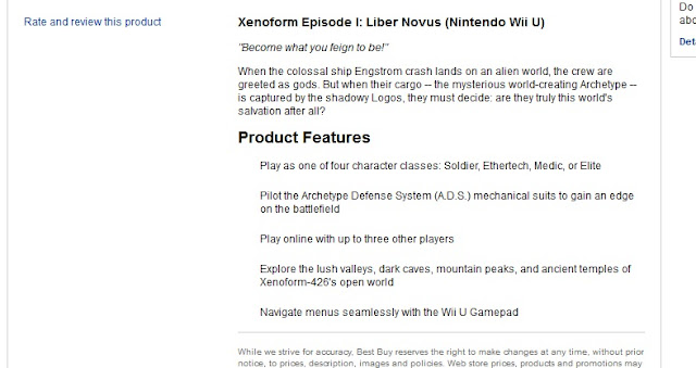 C'est une très grosse rumeur provenant de Gamefaqs d'un membre se disant bosser chez Bestbuy et qui aurait rédigé la fiche descriptive du prochain jeu de Monolith Soft. Le titre ne serait donc pas une suite de Xenoblade mais tout simplement un nouvel opus dans la série nommé Xenoform I: Liver Novus. Il y a aussi mention d'un jeu jouable jusqu'à 4 joueurs. Je vous laisse lire la fiche ci-dessous avec la traduction provenant du site Urbodyisready.
