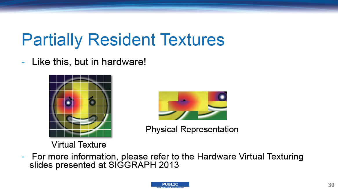 Both AMD GPUs in PS4 and Xbox One support partial resident textures, but we know for a fact Microsoft added additional dedicated hardware in the X1 architecture to focus on this area beyond AMD's standard implementations. Where Sony did not.