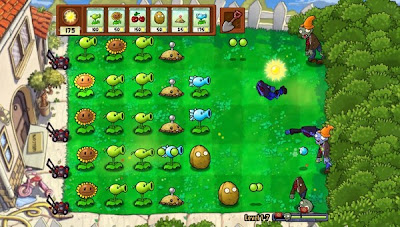 The goal of each level in Plants vs. Zombies is to grow and distribute plants to fend off a zombie invasion of the player's house. Sunshine serves as the energy source to grow plants, which range from peashooters and sunflowers, the latter of which generates additional sun energy, to explosive cherry bombs and some fungi that only appear at night. It's up to each player to determine where and when to place each plant so that the zombie horde is kept away from the brains (and the people attached to them) inside the house.