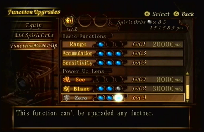 Another change to the camera is upgrading it. Points are still required to enhance the camera, but in addition to that, spirit orbs are also required. There are slots for each part of the camera, which require a spirit stone in each of them to perform the upgrade. Without them, you cannot do so. Now you must be sure to be on the look out for these as you progress through the game.