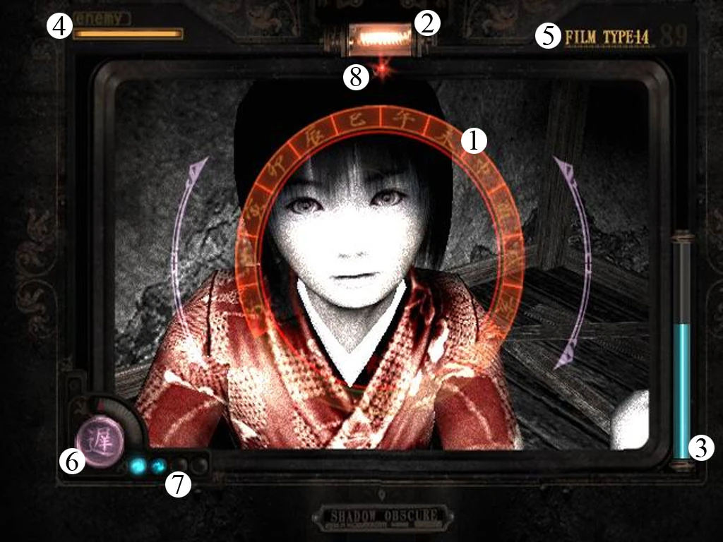 The gameplay of Fatal Frame II remains largely the same as the previous game. The Camera Obscura returns as the primary weapon, but a few changes were made. One of the more noticable ones being the function of the characters on the bottom on the camera. Their function and location were moved, placed around the center circle of the camera. Also, rather than the camera charging to build power, more of the characters will light up the closer the ghost approaches you. So the camera's power becomes stronger only when the ghost comes closer to you. More of the ring will light it as ghosts approach you. I find this to be a bit of a bummer, as the risk/reward is basically gone, only having the risk part of it.