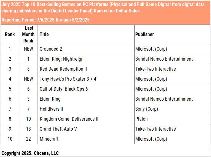 Here are the top 20 best-selling games in terms of dollars for July 2025: