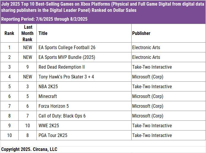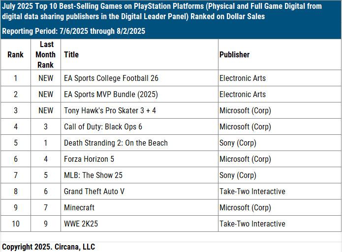 EA Sports College Football 26 was the best-selling game in July 2025 and is already the third best-selling game of the year. The EA Sports MVP Bundle came in second place for the month and is the 12th best-selling game of 2025.