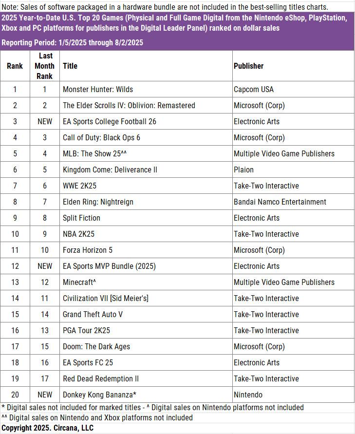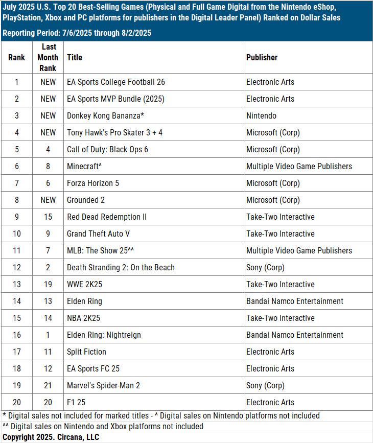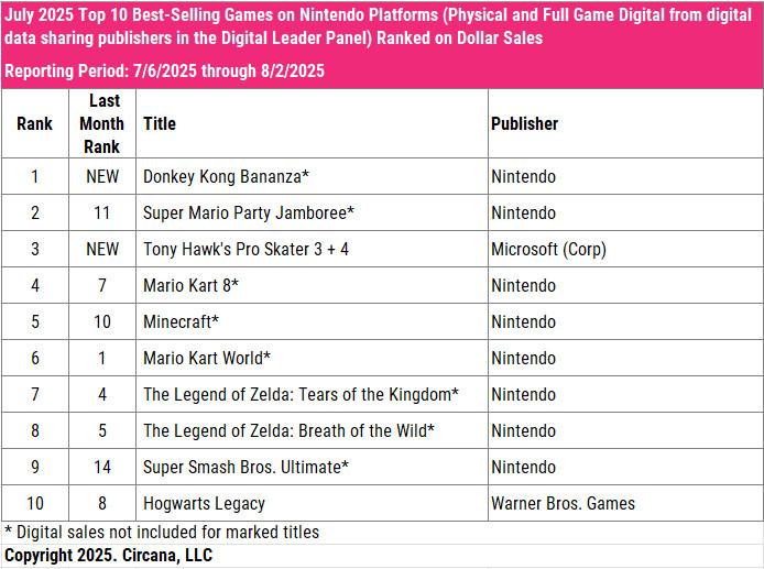 Despite not including digital sales, Donkey Kong Bananza was the third best-selling game of the month and is the 20th place best-selling year-to-date. It was the best-selling game in July on Nintendo platforms.