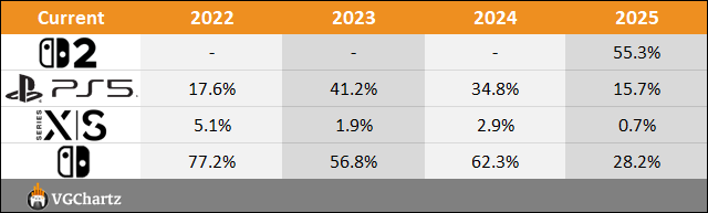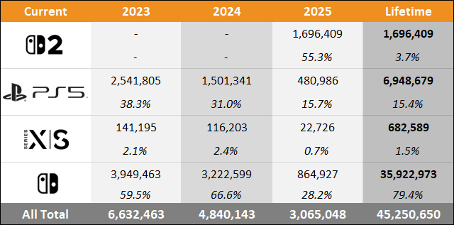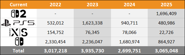 Looking at sales month-on-month, Nintendo Switch 2 sales are down by nearly 3.85 million units, PlayStation 5 sales are down by over 225,000 units, Xbox Series X|S sales are down by nearly 13,000 units, and Nintendo Switch 1 sales are down by over 71,000.