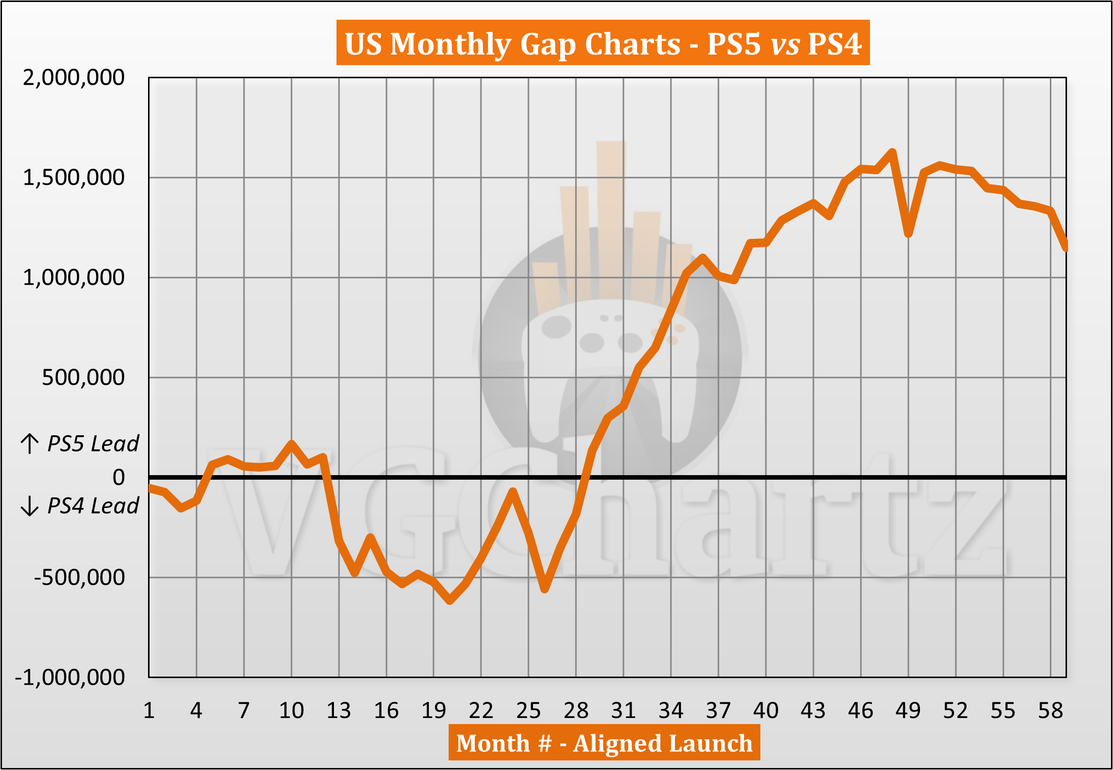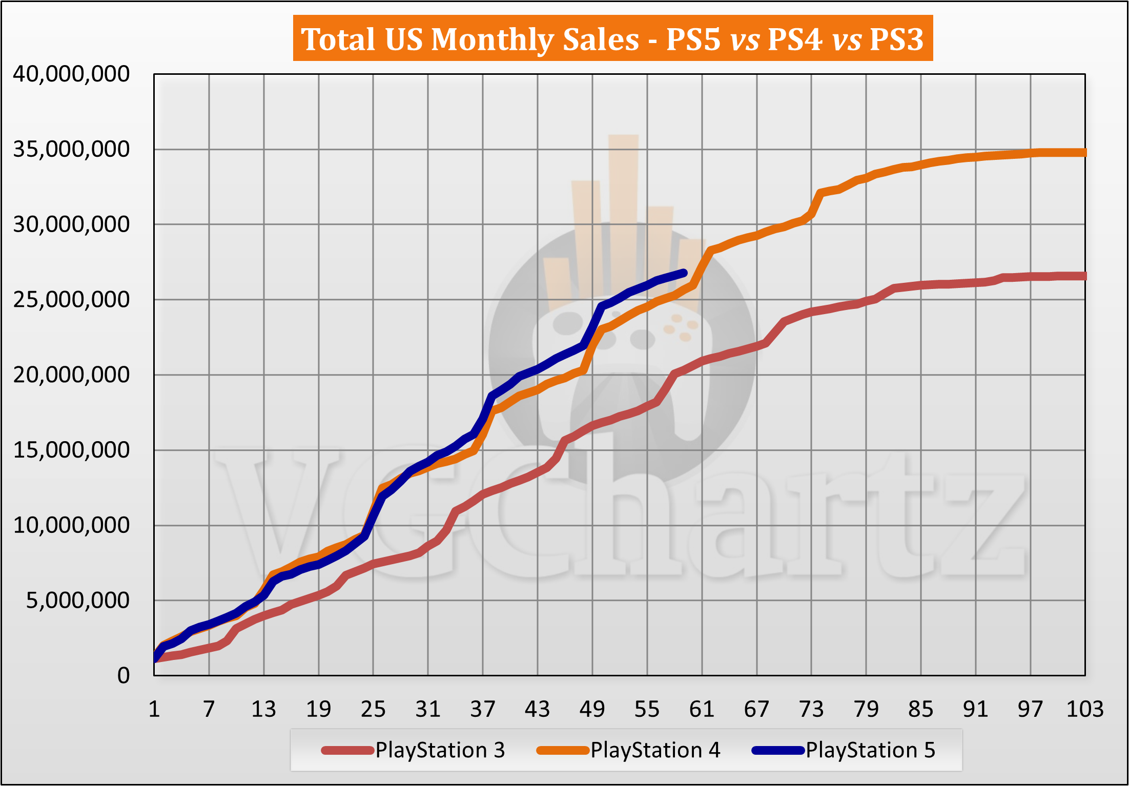 This monthly series compares the aligned worldwide sales of the PlayStation 5 and PlayStation 3.