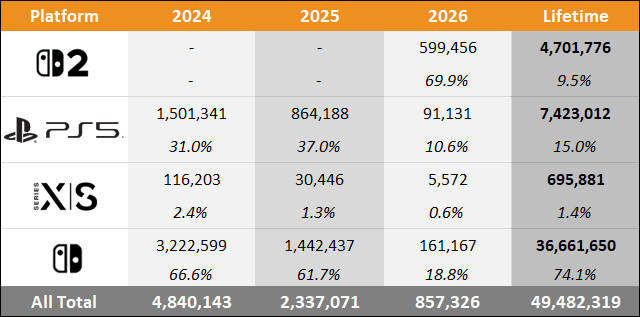 2026 year-to-date, the Nintendo Switch 2 has sold an estimated 0.60 million units, the Nintendo Switch 1 has sold 0.15 million units, the PlayStation 5 has sold 0.09 million units, and the Xbox Series X|S has sold 0.01 million units.