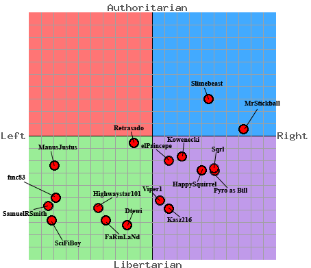 It looks like the furthest drifter is by and large SamuelRSmith. He has done a complete economic flip-flop, Mike Gravel style. The other notables include SciFiBoy's slight drift right, my drift lower-right, and Farmland's drift right. All in all, almost every test taker (twice) has drifted to the right. Of course, we're missing a few that took the tests. |