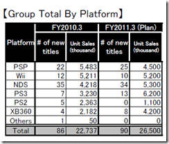 Take a look at this chart, it’s an outline of Namco Bandai’s publishing plans for each platform, In fiscal year 2011 (that’s April 2010 to March 31, 2011), Namco Bandai plans to publish thirteen PlayStation 3 titles, but only eight Xbox 360 games.