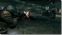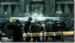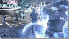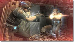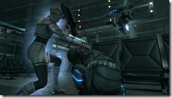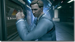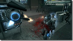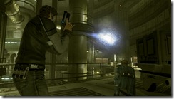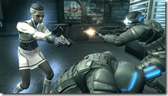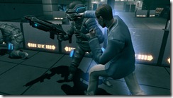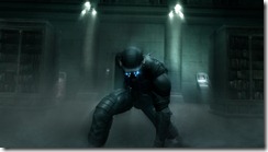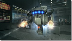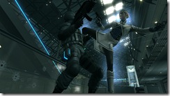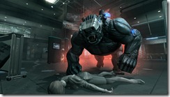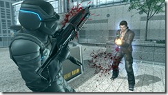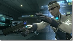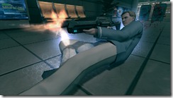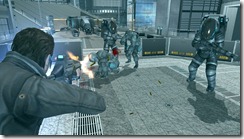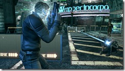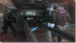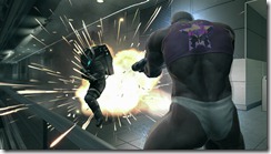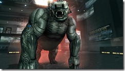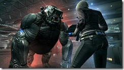 Levels have an interesting set of characters running around. There are flight attendants from Luna Airways, macho men in briefs, tiny flying robots, and… cybernectic gorillas that you can take over. The man versus mecha monkey battle begins in October when Mindjack comes out on PlayStation 3 and Xbox 360 in North America.