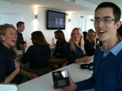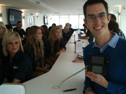 James impressed Nintendo's PR ladies with his 3DS skills First things first: there were no new titles available here, no new information about the 3DS and no word on its release date and pricing. It was simply a chance to get hands-on with the machine to see if it lives up to the hype. Making a beeline for the 3DS, only three games were playable: PilotWings Resort, Hollywood 61 and Nintendogs + Cats, though no cats were available in the demo. Tending to a beagle, labrador or Yorkie, we were able to stroke the furry critter and moved close to the camera to allow it to lick our virtual face, though this feature was a little temperamental. Although it's hardly pushing the 3DS technology to its limits, the screen resolution, texture clarity and realisation of the room in 3D was impressive, and let's face it: this one is going to sell millions no matter what. You can see all the way to the edge of the world Taking to the skies in PilotWings Resort, this again demonstrates the depth of the 3D screen, which is every bit as good as Corbie's 3DS First Impressions from E3 state: pin-sharp right to the horizon, with the slider up to full the sight of Wuhu Island rolling into the distance is a sight to behold. Smooth, crisp and clear, the technology is undeniably impressive, though the game itself is little more than a demo: piloting a biplane, you fly through rings to accumulate points. It's hardly NiGHTS into Dreams in its intricacy, but it shows off the depth of the screen very well. The second part of the demo was a rocket pack level set in the main town on Wuhu Island, where you use the analogue slider to tilt your Mii's boosters to fly into balloons, popping them on contact. Another simplistic game, this was less impressive than the biplane level but with both games featuring score elements these could gain some longevity on release. Hollywood 61 was the final playable 3DS game, developed by Ubisoft unlike the other playable games on display. It’s basically a murder mystery game where you solve Professor Layton-style puzzles. In the example we tried we were tasked with the challenge of rotating various mirrors in order to reflect a beam of light and ultimately illuminate the theatre. It was nothing we haven't seen before, and the 3D effects were no great shakes during the actual gameplay. Careful - he'll lick your face The abundant cutscenes showed off the 3D capabilities of the 3DS much better however, but it has to be said that hand-drawn characters and scenes simply do not impress half as much as the polygon-filled Mario Kart demo. The cutscenes in Hollywood 61 felt more like cardboard cut-outs stacked on top of one another: nice enough, but nothing groundbreaking. Move on folks, there’s nothing to see here. The only other truly interactive feature on show was the 3DS's 3D camera. A simple matter of point-and-shoot, the dual external cameras do all the hard work, with a variable slider letting you alter the focal length. The effect works best when the subject gestures towards the camera – our models dutifully performed a wide range of poses allowing us to see the effect in full, and although the long-term uses of these 3D photos are uncertain it's clear this feature has a lot of instant appeal: being able to snap a friend or landmark and view it in 3D in the palm of your hand is an enticing proposition. Seeing this moving in 3D is astonishing All the other titles were displayed in non-playable format, though some had limited camera interaction. Mario Kart 3Dlooked fantastic: clear, bright and smooth, this is another runaway success in the making, although sadly there were no other Nintendo titles available in live format. That's right: no Ocarina of Time, no StarFox 64 and no Animal Crossing, with Kid Icarus: Uprising only present in a (rather poorly compressed) 3D movie. Thankfully other demonstrations delivered, with Resident Evil: Revelations pumping out graphics we never thought a Nintendo handheld could offer, with a user-controlled camera letting you pause and explore the scene in real-time. If the full game can produce graphics of this calibre it'll easily be one of the best-looking titles ever seen on a handheld. Metal Gear Solid: Snake Eater 3D offered a much longer demonstration that offered mindblowing moments; arrows flying in to pin down Snake, falling from a bridge and the climactic duel with The Boss all stunned, but other areas showed the lack of time Kojima Studios spent on the demo, with some blocky textures and unconvincing animations. Still, as a demonstration put together in a short space of time it still impresses, at least on a par with PSP’s Metal Gear Solid: Peace Walker in the graphical stakes overall. Oh James, you're so funny Other 3D delights on show were a trailer for upcoming filmLegend of the Guardians: The Owls of Ga'Hoole that, although a film about talking owls, looked impressive: the 3D screen gave the owls remarkable solidity and roundness, although the 3D slider here only switches the effect on or off, with no middle ground. Still, the top screen is extremely clear and sharp, and this was shown off in a further demonstration. Combining specially-shot 3D clips such as a champagne cork popping towards the camera with dioramas of Nintendo characters – one featuring none other than Captain Olimar and friends – this was a clear indication that the 3DS is engineered as a multimedia machine, with a screen large and clear enough to display films comfortably. Although we were disappointed that several of our most anticipated games weren't available – where were Ocarina of Time, Animal Crossing, StarFox, Paper Mario and the rest? – we're happy to confirm the machine is every bit as good as previous reports have stated. Schmoozing with the PR honeyz The depth in the 3D screen is mindblowing, with details clear all the way to the back, and it genuinely does make it easier to perceive the game world and how the objects relate to each other. The sweet