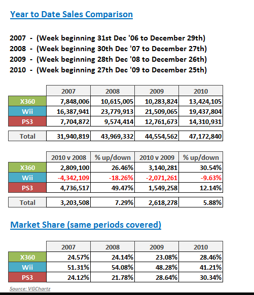 In VGC PS3 lead by over 600k. X360: 13,112,635 13,424,105 * Theses numbers doen't include the first 3 days of 2010. Before adjustments 360 was near or over PS3 on year. |