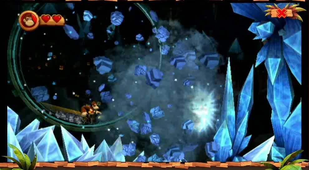 Many don't like the mine cart levels for thinking they are hit or miss or just plain decoration of them, but I think they require more fast thinking and ability to dodge all obstacles of the course. Bombs Away is exactly this, you'll face many hard parts where you have to press down to not be hit or not jump very high as well, but this levels is just pure win, from the mole (in the foreground) trowing bombs at you in the backround or the mind blowing part at end where you rail through a circular rail (in the pic above).