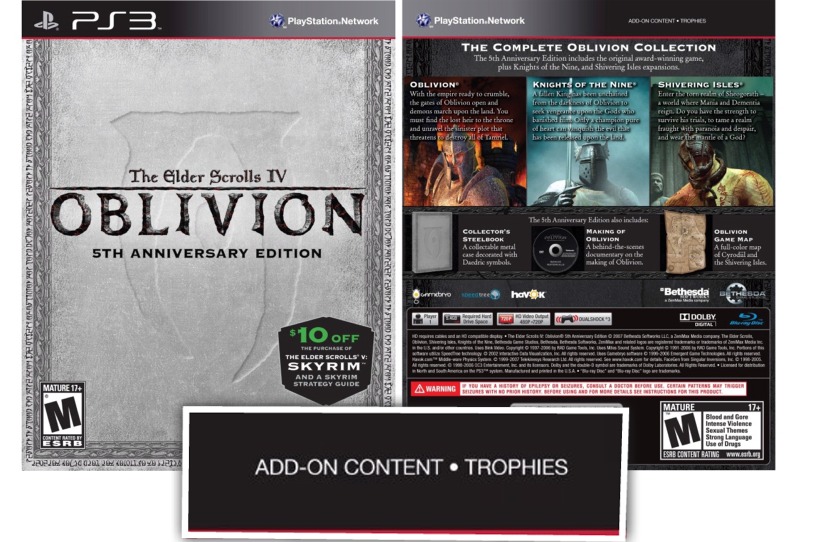 On Monday, we brought you the news that The Elder Scroll IV: Oblivion would be getting a re-release in the form of the ’5th Anniversary Edition’, ahead of Skyrim’s debut later this year. With the boxart now posted over at Amazon, it looks like trophies may well be included in this new edition of the game.
