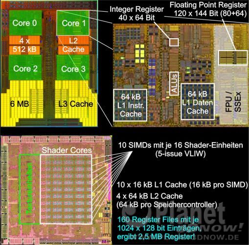 Now notice how each SIMD array has 3 full blocks but 2 "half-blocks" above and below the 3 full ones? If those are somehow active, you end up with 3+ 1/2+1/2 = 4 Sub-blocks per 1 SIMD or a total of 4x 20 = 80 Shaders per SIMD. 8 Total SIMDs x 80 Shaders would give 640 Shaders (exactly the same as RV740).