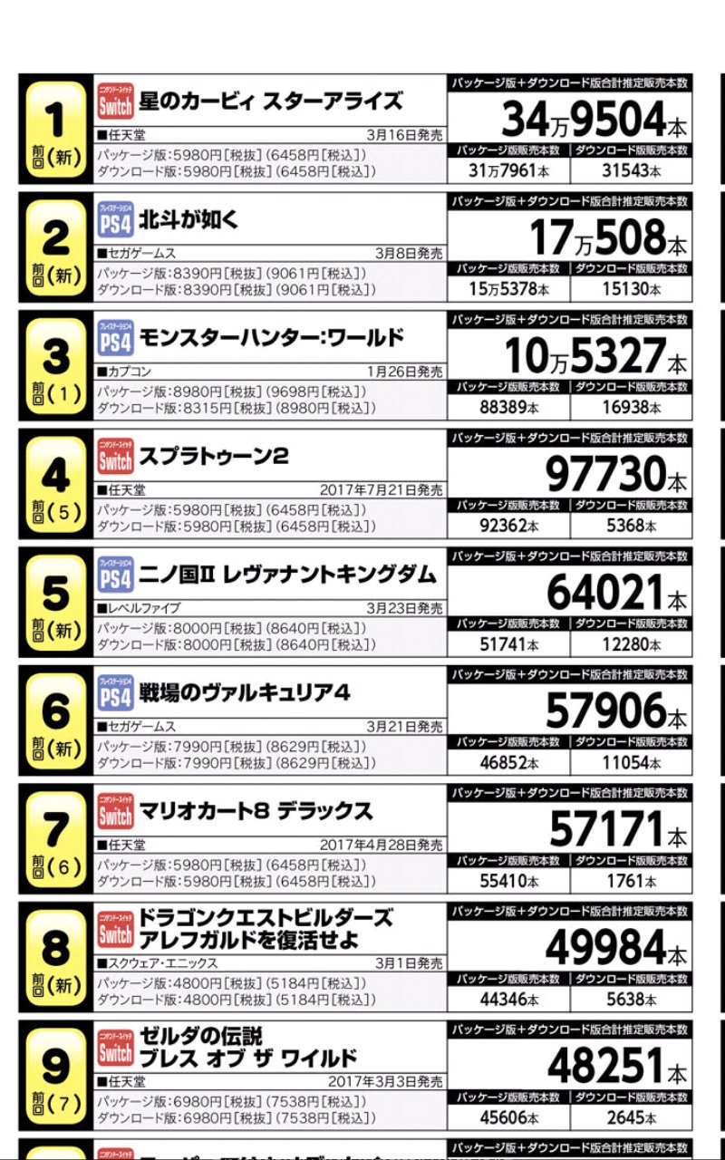 Digital sales are in the bottom right box. In this chart, Kirby sold 31k digitally in March for a total of 350k physical + digital. MonHun World did another 17k digitally, etc.