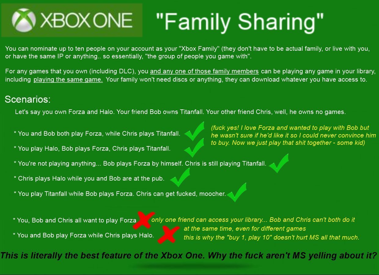 Also the linked "explanation"isnt oficial, so it can be totaly bogus, and alot of stuf are unclear like for instance I own Forza, I turn my Xbox on the morning and "my friend Bob"is playing my Forza and I go fck it, I want to play my Forza right now and I log in my account and kick Bob out ? Do I get locked out of my game ? Can Bob even play if my Xbox is turned off ? What if I travel and my Xbox hasnt mailled home for a week did I just screw my entire "family"? the thing is so nebulous and not well explained right now that almost all the amjor gamming websites have just said this thing exists and not even triedto explain the heck it is.