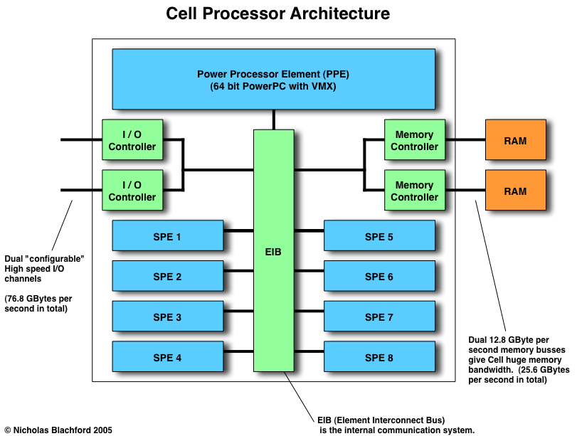 Each of these elements inside the cell are clocked at 3.2GHz and are connected on a 4 ring Element Interconnect Bus(EIB) capable of a peak performance of ~204.8GB/s. Every processing element on the bus has its own memory flow controller and direct memory access (DMA) controller. Other elements on the bus are the memory controller to the 256MB XDR RAM, and two Flex I/O controllers.