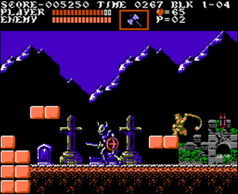 The original classic style of Castlevania is a stage based platform series where you attack oncoming enemies with your whip or subweapons. In the original title, you'll start off with a leather whip, but as you collect hearts, there are two more upgrades to the whip that turn it into a chain whip then morning star. Your subweapons, dagger, axe, cross, and holy water each take a single heart to use and getting the double shot and triple shot items allow for up to three subweapons to be on screen at once.