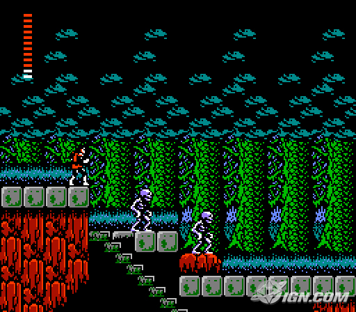 Since Simon's Quest is open world, not all failed jumps result in death. If there's no water then you'll drop down to a lower level and have to climb back up. Across the world there are a few towns and four mansions, so it's a fairly large game. Most enemies unfortunately walk back and forth, maybe walk the players direction, float towards the player, or hop towards the player, etc. The AI is rather lacking and the only reason the game can be difficult is if you're not equipped with a powerful enough weapon. A leather whip at the end of the game will be atleast eight hits on most enemies, if not more.