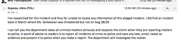 “I’ve just another conversation with SFPD. They say they are aware that the Sarkeesian case is being dealt with by the FBI. They don’t have records of calls made in August, which may or may not be because the case was handed off to federal agencies. I’ll follow up with the FBI later, but, irrespective of the merits of her complaints, Anita Sarkeesian is indeed dealing with the FBI.“