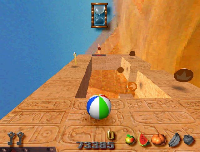 The player controls a beach ball around an assortment of blocks to find a way to get the keys that open the level's exit. Along the way there's coins and gems to be collected for points and fruit to be found that unlock bonus levels. To do this, the player can move the ball around all sides of the block at a platform's endpoints. All this must be done within a time-limit. The content is gigantic, and the game possesses a steep leaning curve and later levels contain more and different hazards or tricky jumps and more elaborate block-structures. I've never beaten it's whopping 160 levels. It is addicting though, so much even that this game is the only PlayStation Classic, I ever downloaded on my PlayStation 3.