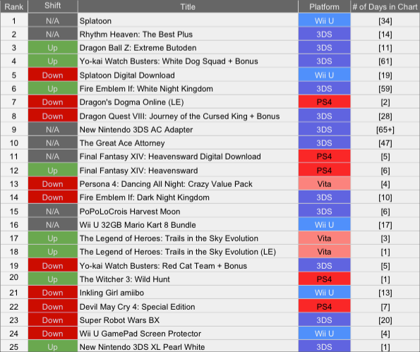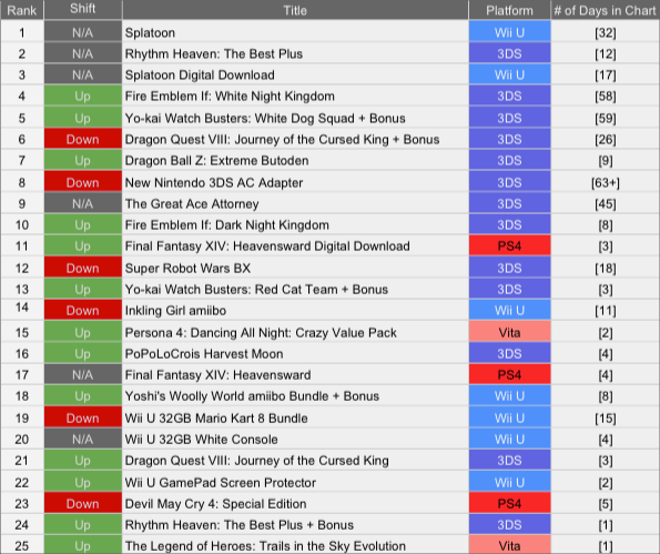 For the record, in the time that I've been doing these charts, I've never seen a game stay in the number 1 position for this long (as of now, Splatoon has been at the top for 14 days).