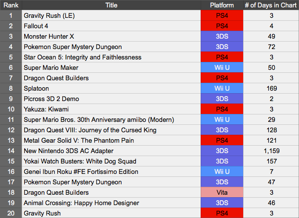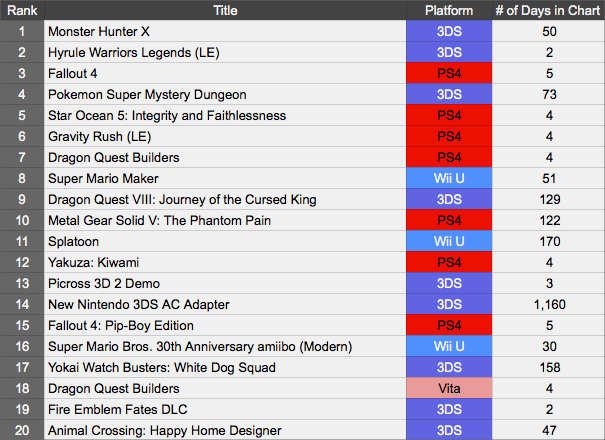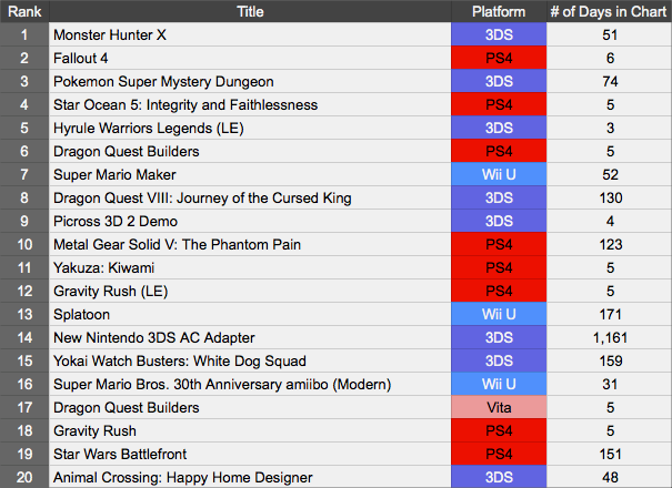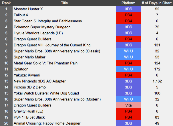Mario Maker holds in the top 10 and Splatoon finally falls out of the top 10 all the way to...eleven. Personally, I'm happy to see Fallout 4 doing well over there, showing there are some western games that can penetrate the Japanese market. Well, when they launch on PS4 anyway :P