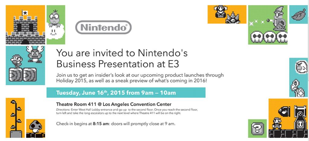 "Nintendo has started sending out invitations for a “business presentation” that will be held at this year’s E3. The company plans on discussing what lies ahead through Holiday 2015 along with “a sneak preview of what’s coming in 2016″.