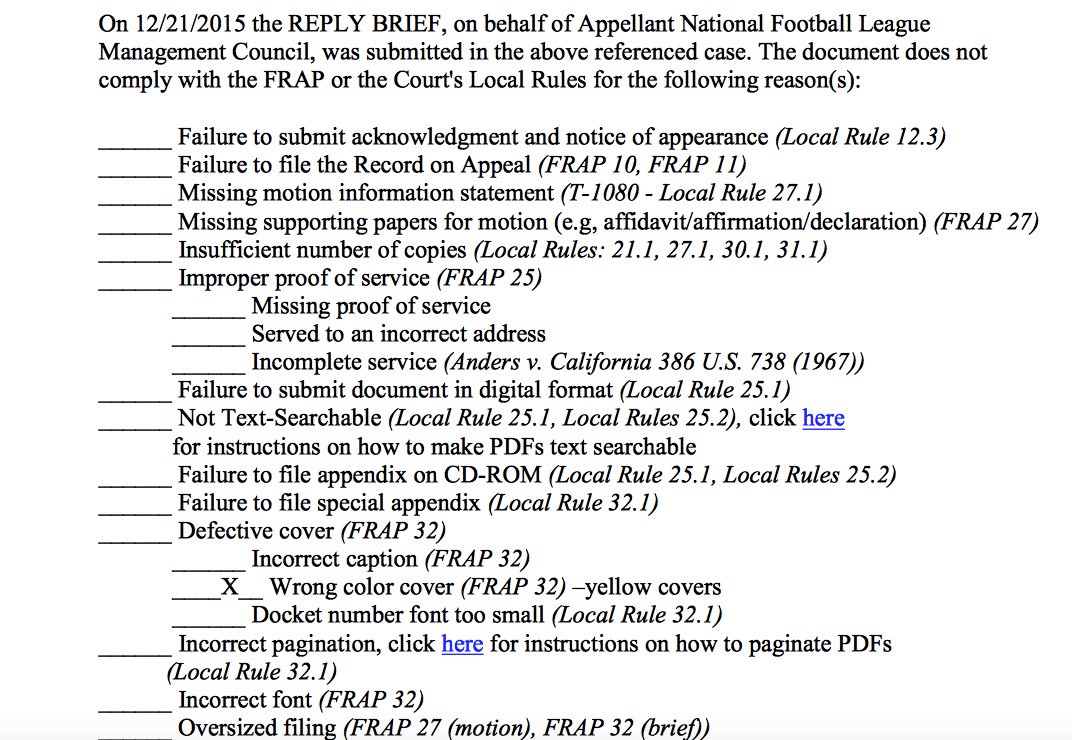NFL flagged for rules violation in #Deflategate appeal; filed brief with “wrong color cover” and ordered to refile. pic.twitter.com/ZLsuOfnCly