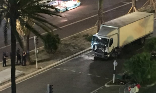 Another image on Twitter showed a white lorry stopped in the middle of the promenade with damage to its front, and four police officers observing it while taking cover behind a palm tree.