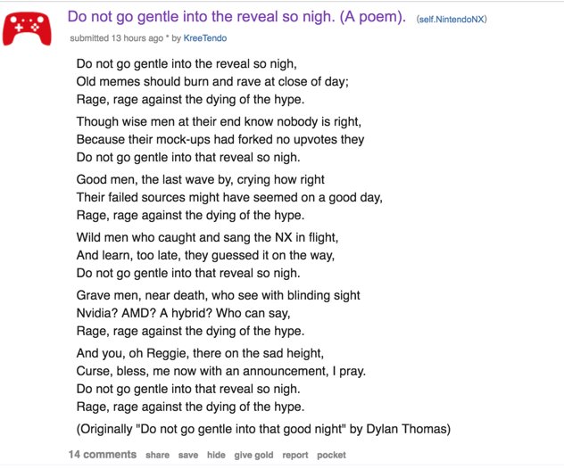 Some Nintendo fans are going completely crazy about this NX thing and it's really annoying. Some days half of the threads here are about the NX with NOTHING new about it. And anyone trying to speak logically about it or who just don't care about it is seen as a hater.