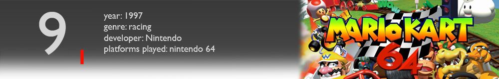 'Mario Kart 64' is the best game in the racing genre ever made to me. I guess probably this is debatable and objectively not so quality-wise in today's world, even in it's own series, but to me, it undoubtedly is. This is because of what it did back in the day as a game, and what it meant to me as a gamer, or bigger yet, as a person. Because of the amount of time I spent with it, the memories attached to it and certainly also the amount of fun I had with it.