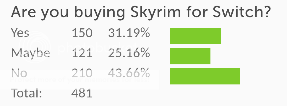 SonytendoAmiibo said:![]() Wow, a lot more votes since the last time I looked, and the percentages are pretty much still the same. So if the Switch sells a conservative number for 2017, say 4 million units, and 30% of those people buy Skyrim, then that is 1.2 million units of the game sold through. The initial launch of 2 million units is already sold out and Switch should easily sell 2 million more by the end of this year. What do you think? Will Skyrim for Switch sell 1.2 million units this year? The poll says yes. |