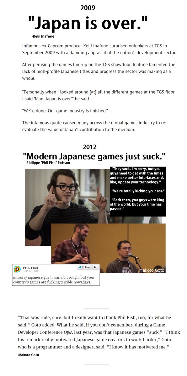 Well, they were both right at the time.Excluding exceptioms, Japanese gamed in the 7th generation were falling way behind, and leaving alot to be desired.They were losing identity, trying to be like western games, and most of them were simply underwhelming.(FF XIII, RE 6, Capcom games in general)