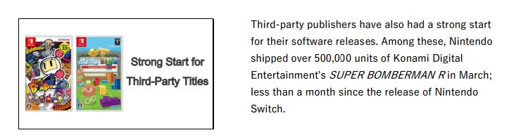 It's great to see Super Bomberman R selling so well considering it was one of the few third party games to even be on the system at launch. Despite what some may think of Konami, it seems good that it payed off for them for being one of the few third parties to even bother putting something on the Switch at launch while hardly anyone else did. (Though it's sort of understandable why some would wait considering how the Wii U turned out, so they probably wanted to see how the Switch would be selling first).