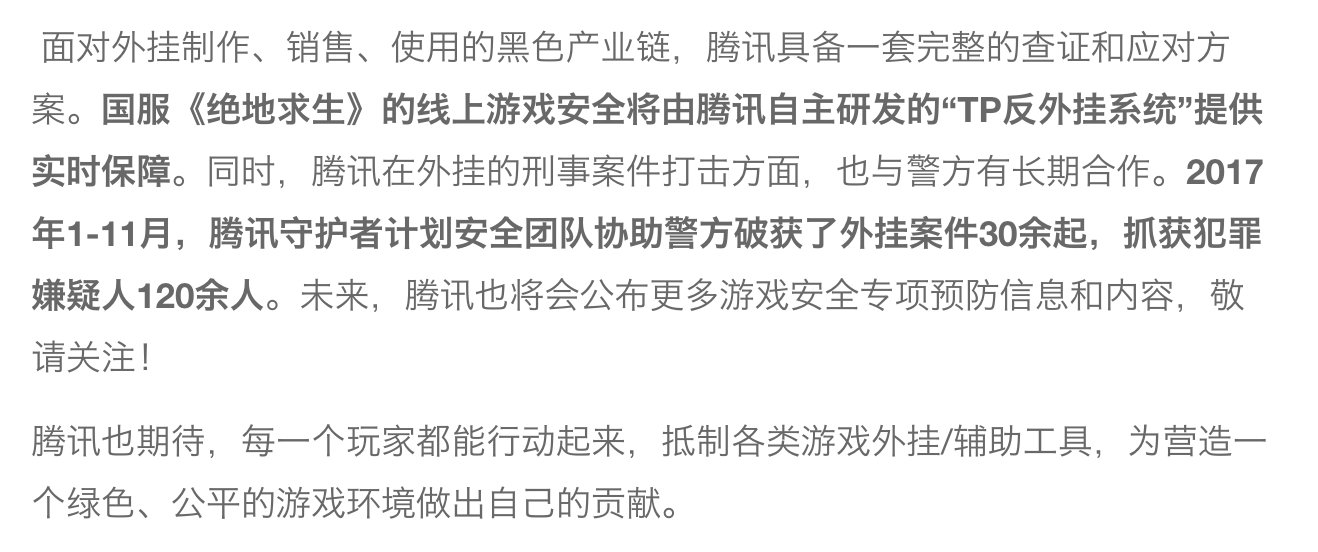 Tencent: "We have opened an anti cheat task force and worked with the police to arrest 120 individuals who have been selling cheat software for the game illegally"