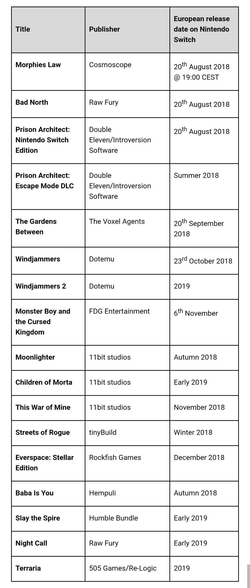 EDIT: A trio of notable indie titles are launching on Switch today. Morphies Law, Bad North, Prison Architect: Nintendo Switch Edition will all be available through the eShop. This news was revealed during the Indie Highlights video from Nintendo of Europe.