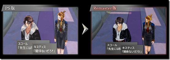 The PC version (pictured above) of Final Fantasy VIII was able to give a shaper look thanks to DirectX anti-aliasing, but it still looked closer to the original version’s textures. Not only does the remaster version touch up on the jaggies, but it also updates Squall’s hair model. Quistis’ skirt has also been changed a bit. We can also see that the fur on Squall’s jacket is detailed to look fluffier.
