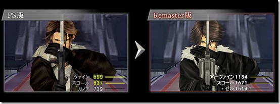 Here we have a comparison showing Squall about to bust out his Renzokuken Limit. We notice right away that Squall’s face has overall been improved so we get to see more of his handsome mug, but another part that stands out is the Gunblade that now has added details. Squall’s hands have also been improved to look less blocky.