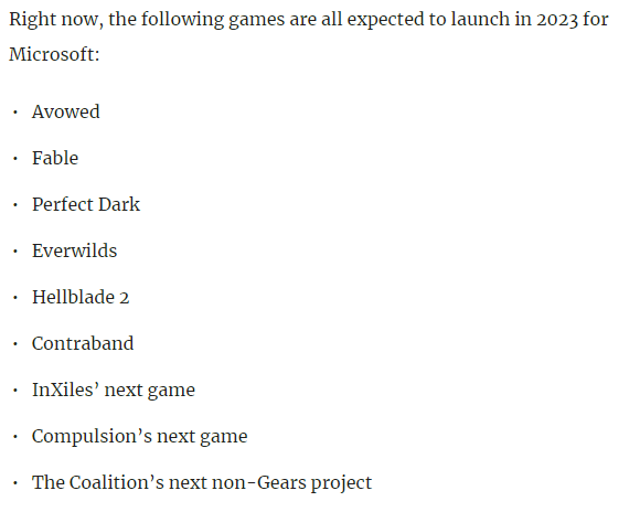 Avowed is likely the furthest along of all of the announced games and i predict that it will release first out of all of those in the list i just pray that it's a surprise for 2022, with the interview that was posted today we now know that Compulsions next game is actually further along that we originally thought so 1st half of 2023 is my guess. If i were to bet i think that Hellblade 2, Perfect Dark and the Coalition New Ip are 2024 with The Outer Worlds 2 being a wildcard for that year, who knows about Everwild right now.
