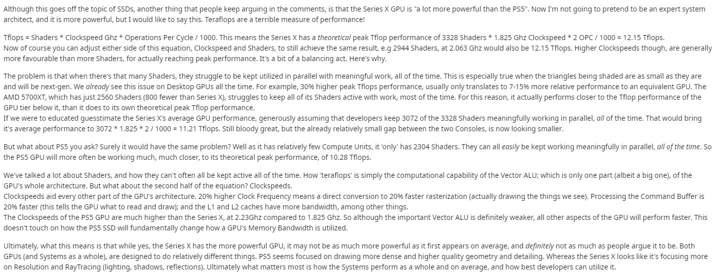 As for the other guy, why would he think the real world difference would only be about 1 tflop? PS5's 10.3 tflop number is achieved using it's maximum clockrate, but the clockrate is variable, it can go lower at times. But even disregarding that, Sony and MS are using 2 fundamentally different GPU strategies. One console has alot of CU's at a slower clock rate, while the other has a lot less CU's at a much higher clockrate. I don't think any of us can say for certain how big the real world difference between the 2 GPU's will be until we have some 3rd party multiplat games out on the market for Digital Foundry to test. That being said though, we do know from PC testing of AMD's RDNA 1 GPU's, that when you compare a GPU with more CU's vs. a GPU with a less CU's at a higher clockrate, games tend to respond better to more CU's than a higher clockrate. Maybe things will somehow be different from that on RDNA 2, but it seems kind of unlikely to me. Raytracing also seems to respond better to more cores than it does to higher clockrates.
