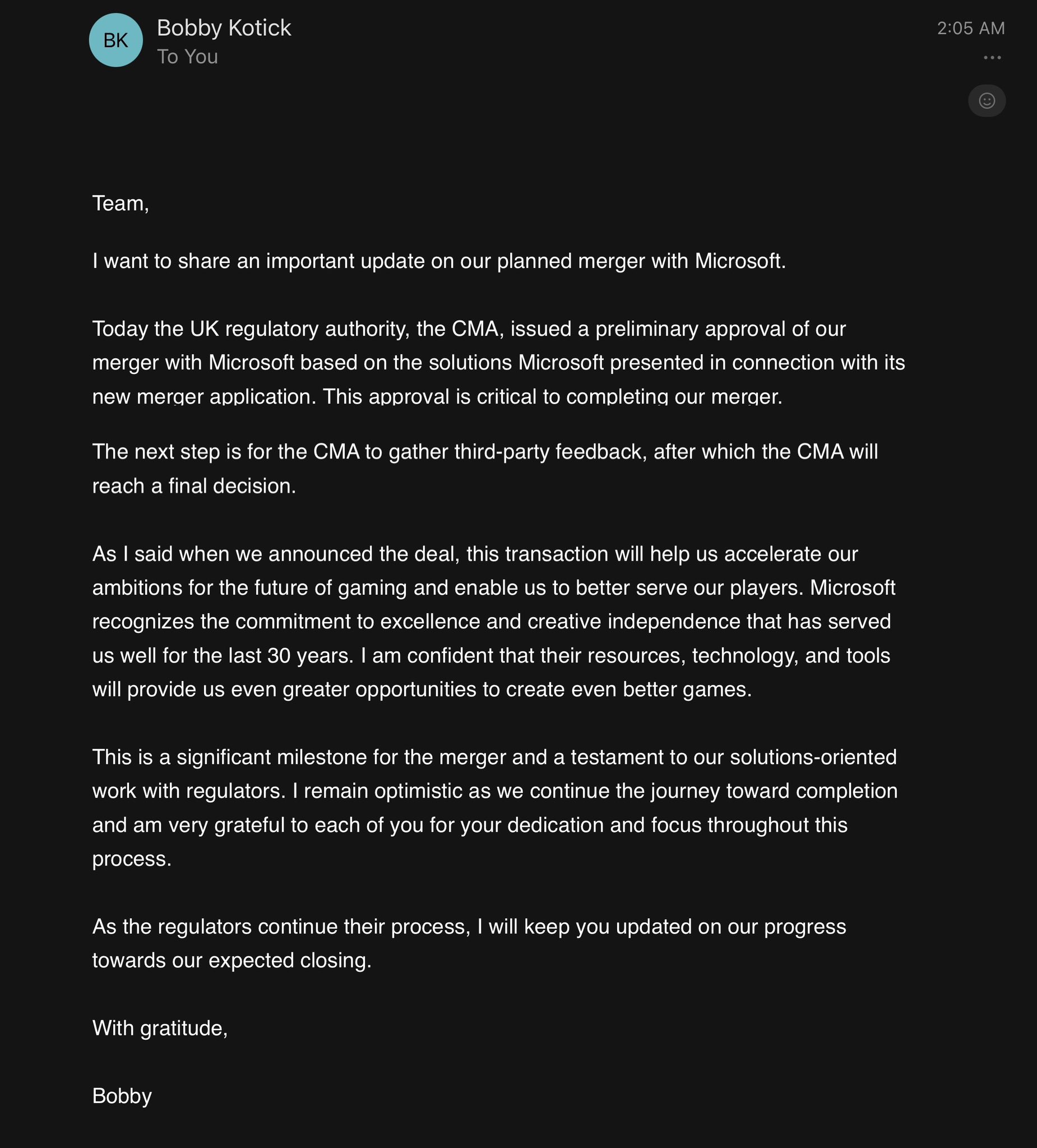 “With additional protections to make sure that the deal is properly implemented, this will maintain the structure of the market, enabling open competition to continue to shape the development of cloud gaming in the years to come, and giving UK gamers the opportunity to access Activision’s games in many different ways, including through cloud-based multigame subscription services.”