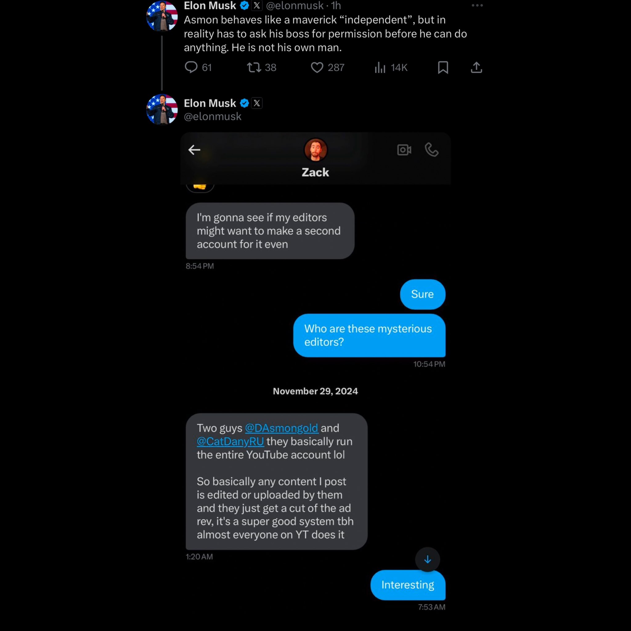 In the next stage of "Musk Fights With" he has now picked a fight with Asmongold, after a dispute with Asmongold he has removed his verification badge, unfollowed him, publicly trashed him and leaked their DMs, Lmfao. This dumb fuck Musk thinks that having "editors" for YouTube videos means that Asmongold is "owned"
