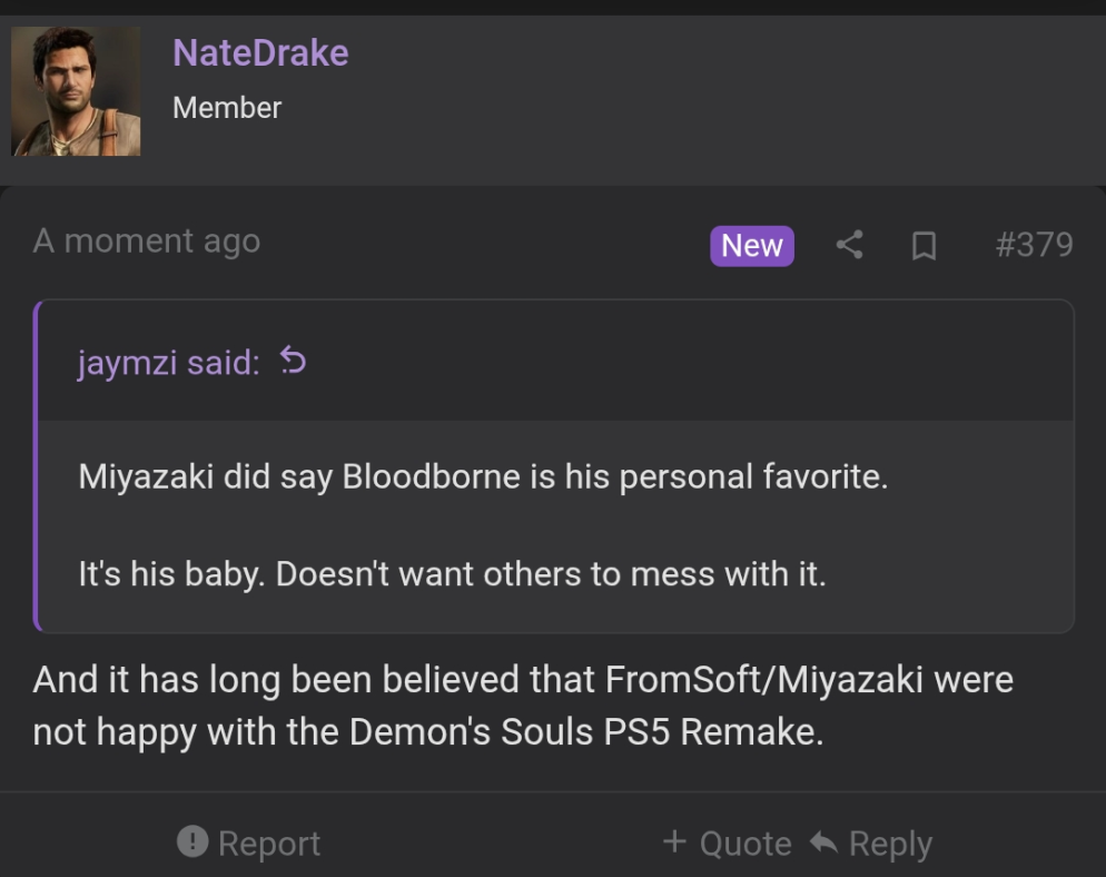 One of the supposedly ex-Bluepoint staff, as its being credited, said of the 2 remakes they pitched, at least 1 was being worked on by another company. So if it is true, it has 50% of being Bloodborne and so it means FromSoftware is already working on it... but if so, why would Sony ask if Bluepoint could remake Bloodborne if FromSoftware was already doing it? It's confusing, unless the remake already being worked into was not Bloodborne, which we already know it was 1 of the 2 of them. |